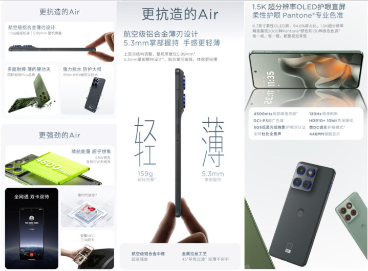 产品配置上面,联想moto X70 Air采用骁龙7 Gen4处理器,LPDDR5X内存和UFS 3.1闪存,6.7英寸OLED直屏,1.5K分辨率,120Hz刷新率,前置50MP摄像头,后置50MP主摄(1/1.56",OIS防抖)+50MP超广角微距,4800mAh电池,68W有线快充,15W无线充电。